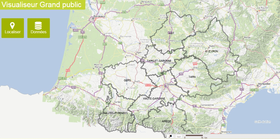 Cartographique dynamique sur Midi Pyrénées, permettant d’afficher différentes données (risques naturels, eau, énergie, biodiversité, …).